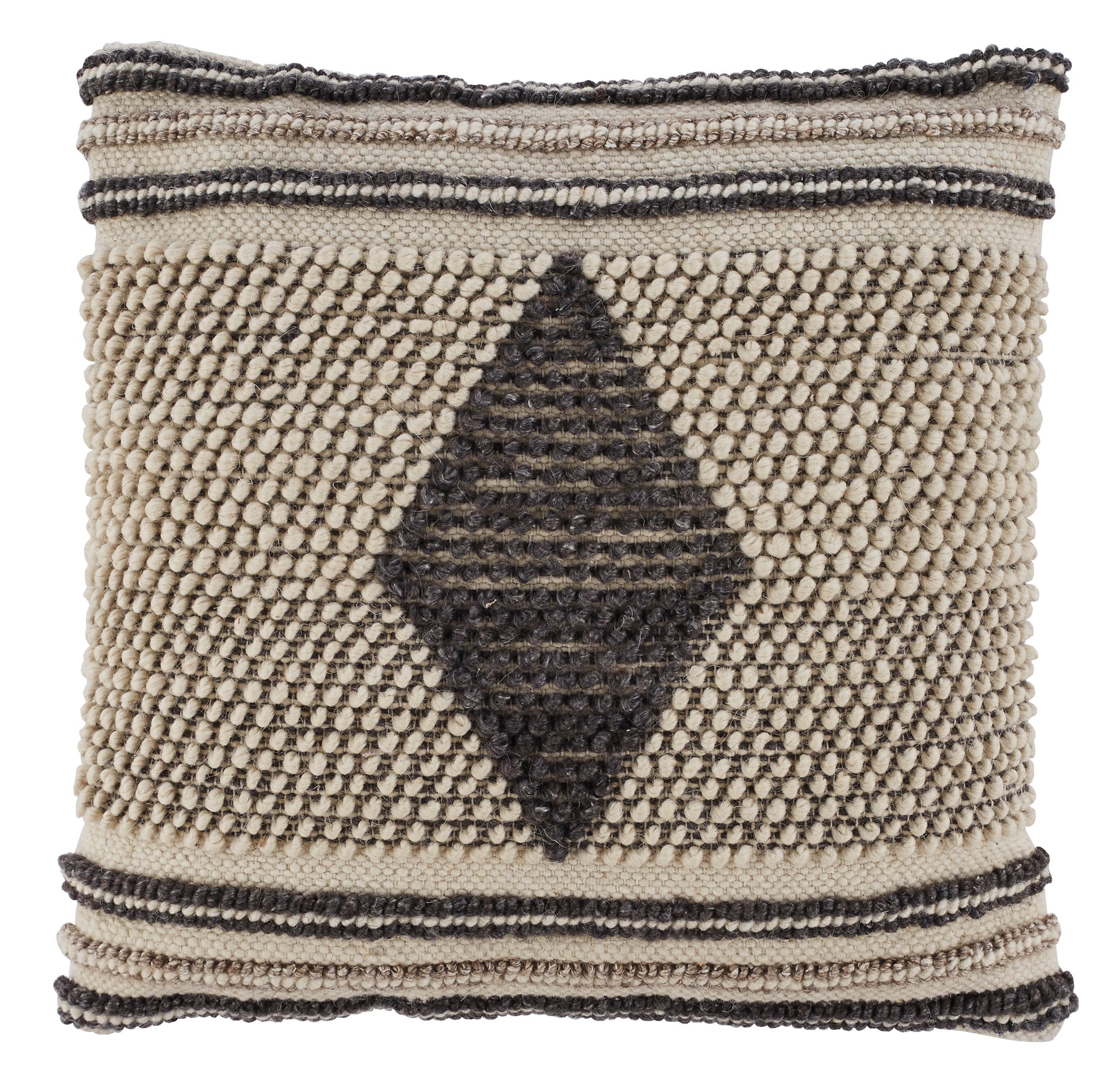This designer accent pillow is such a posh pick for an effortlessly chic vibe. Loaded with feel-good texture and handwoven of cotton and wool, the diamond-patterned cover is pure artistry. Hand woven with diamond design in shades of gray and cream. Solid reverse in cream. Wool/cotton blend face with cotton reverse. Zipper closure. Fiber filled. Dry clean only.