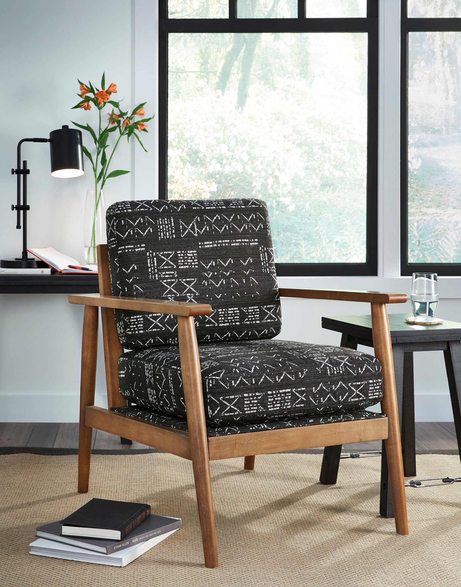 This accent chair offers a perfect blend of style and comfort for your living space. A charcoal printed upholstered seat and back complement the design and invite you to sit back and relax.