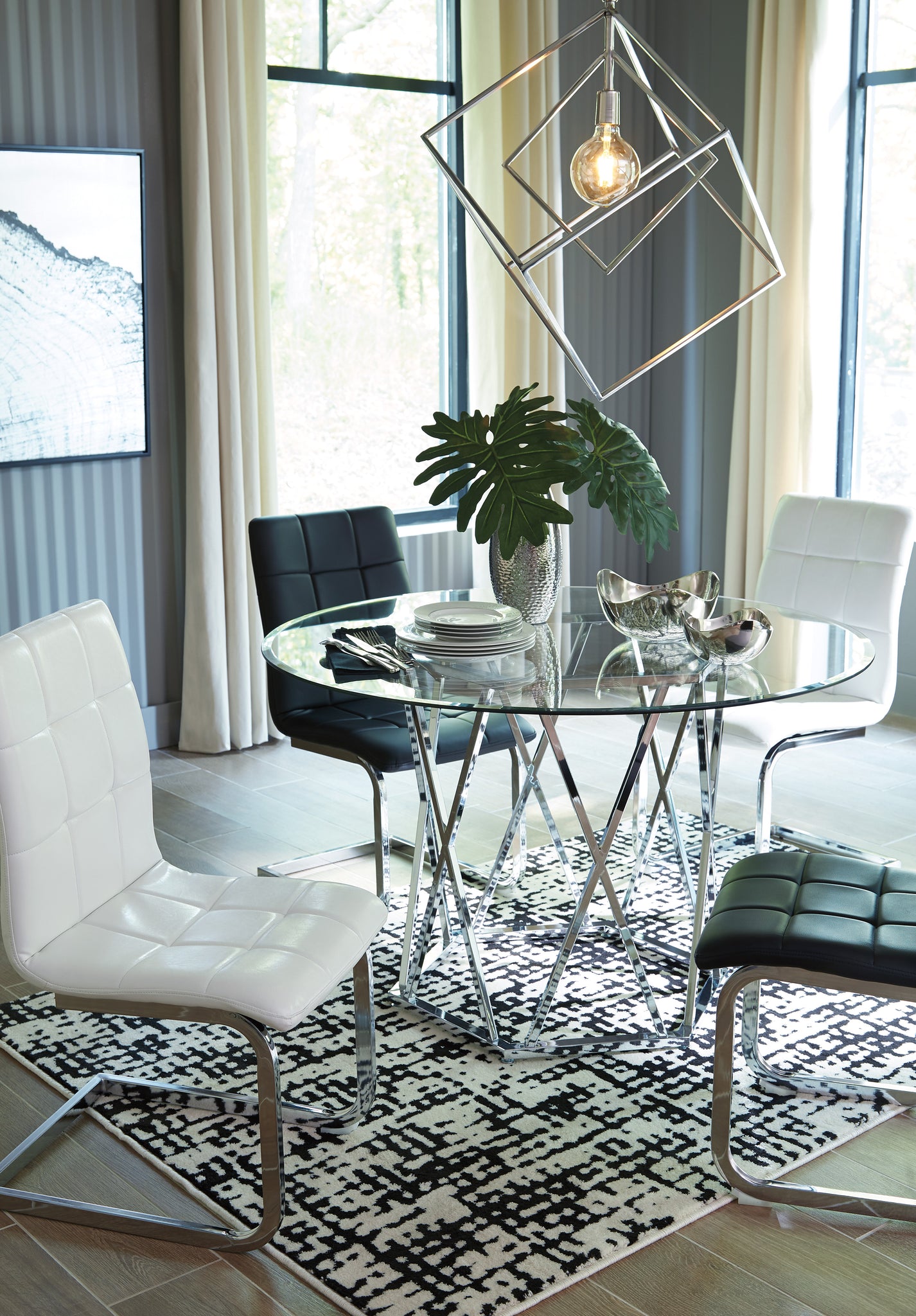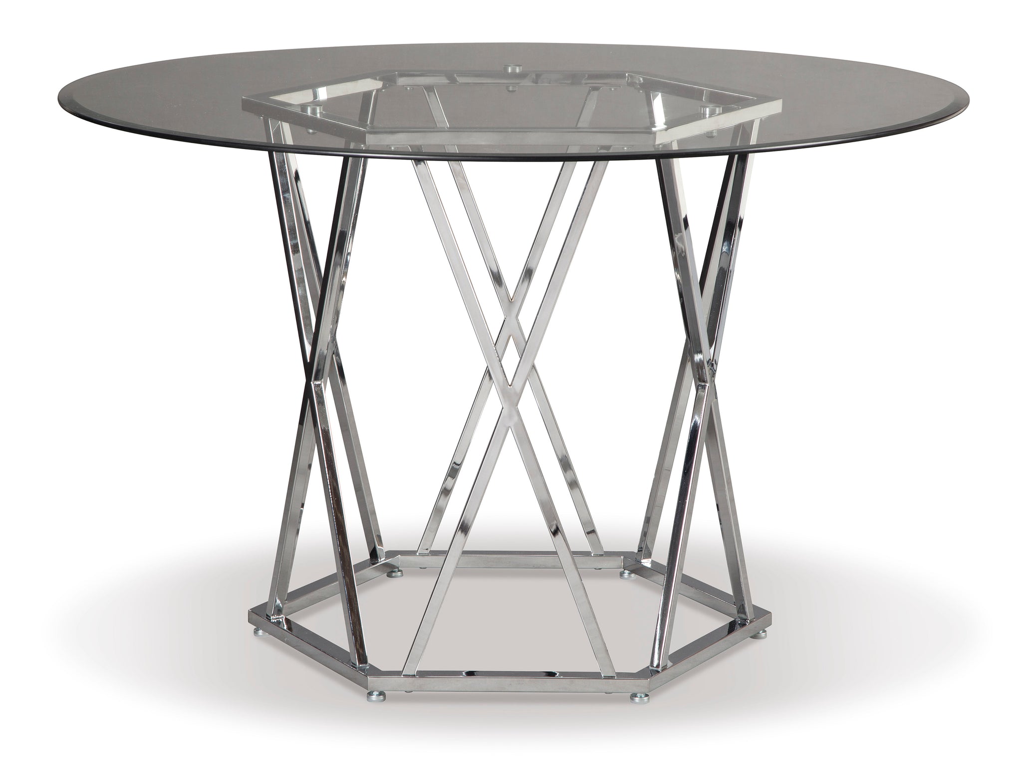 Description: Wowing with an open and airy but sturdy profile, this round dining room table is sure to whet your appetite for ultra-contemporary style. Sporting a chrome-tone finish for a high-sheen effect, the hexagonal metal base is striking from every angle. Clear glass top rounds out the look with sheer simplicity.