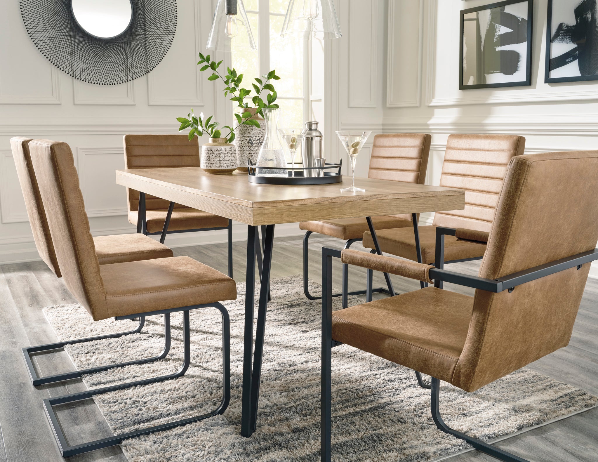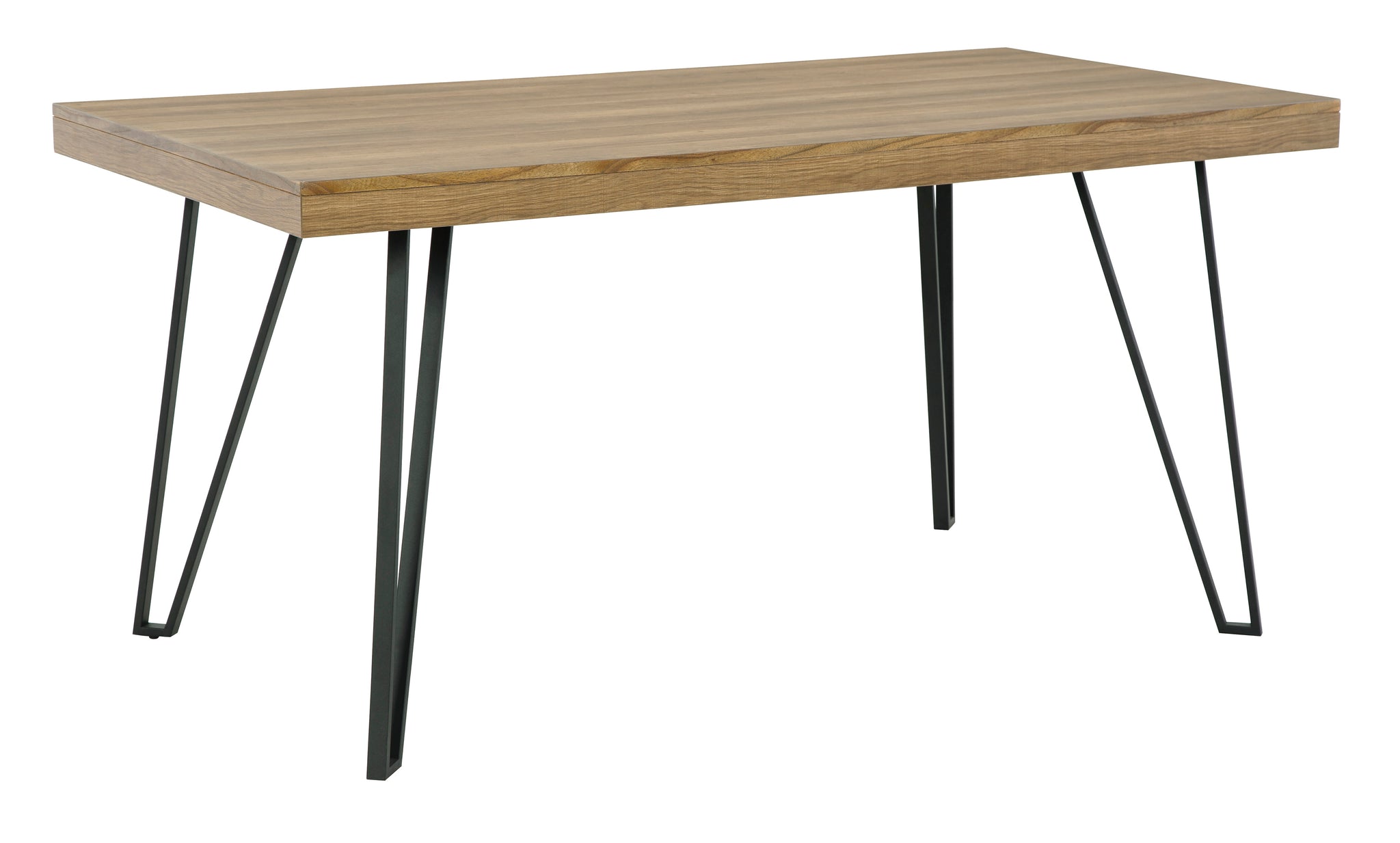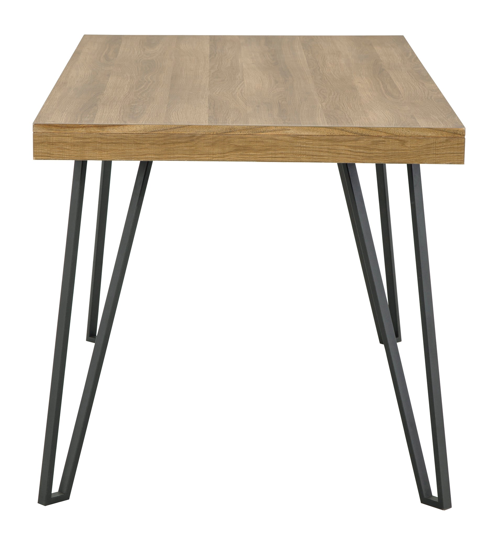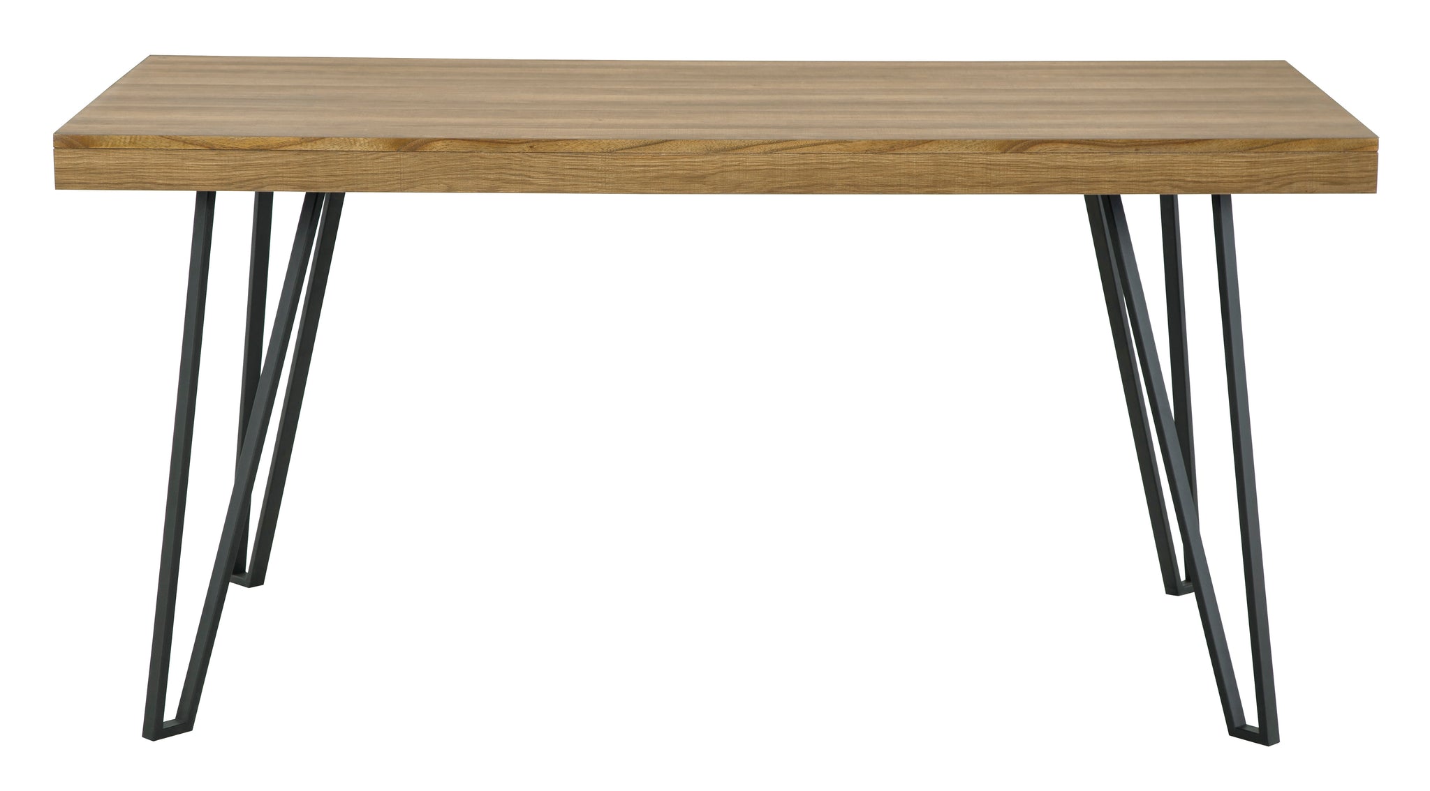 Have a seat in sleek style at this dining room table. Contemporary with a casual vibe, this modern piece is dressed to impress with a replicated light brown wood grain tabletop, paired with sculptural black metal hairpin legs.