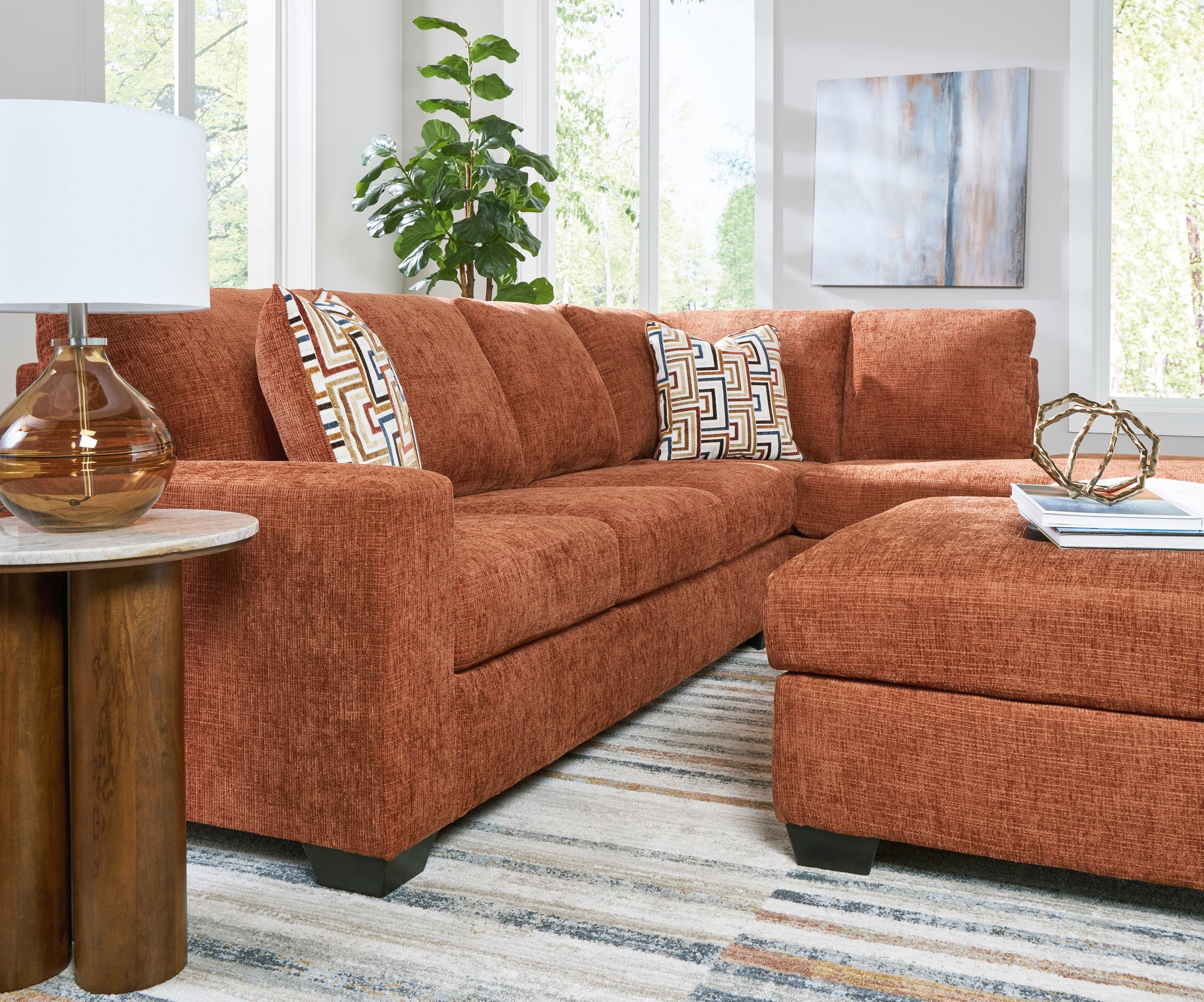 Looking to make a bold statement with color? Liven up your living room with this sectional with chaise. Its trend-right burnt orange upholstery adds a playful pop of color to your decor. Bold and eclectic accent pillows complete the look. Pairing posh style with everyday comfort, the sectional is a welcome addition to contemporary spaces.