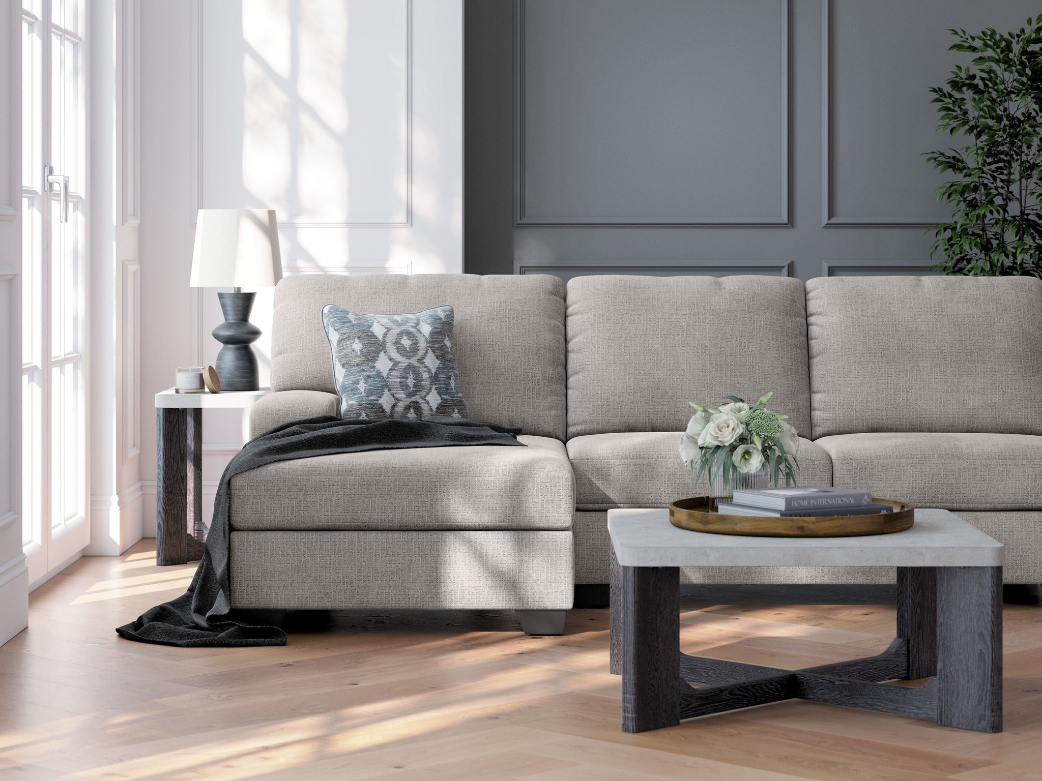 Why choose between cool, contemporary style and a comfortable fit? This sectional with chaise marries the best of both in perfect harmony. Its clean-lined profile, plush chenille fabric and splendid cushioning make it so inviting. With a richly neutral hue and distressed geometric accent pillows, this sectional instantly transforms your room with a designer aesthetic.