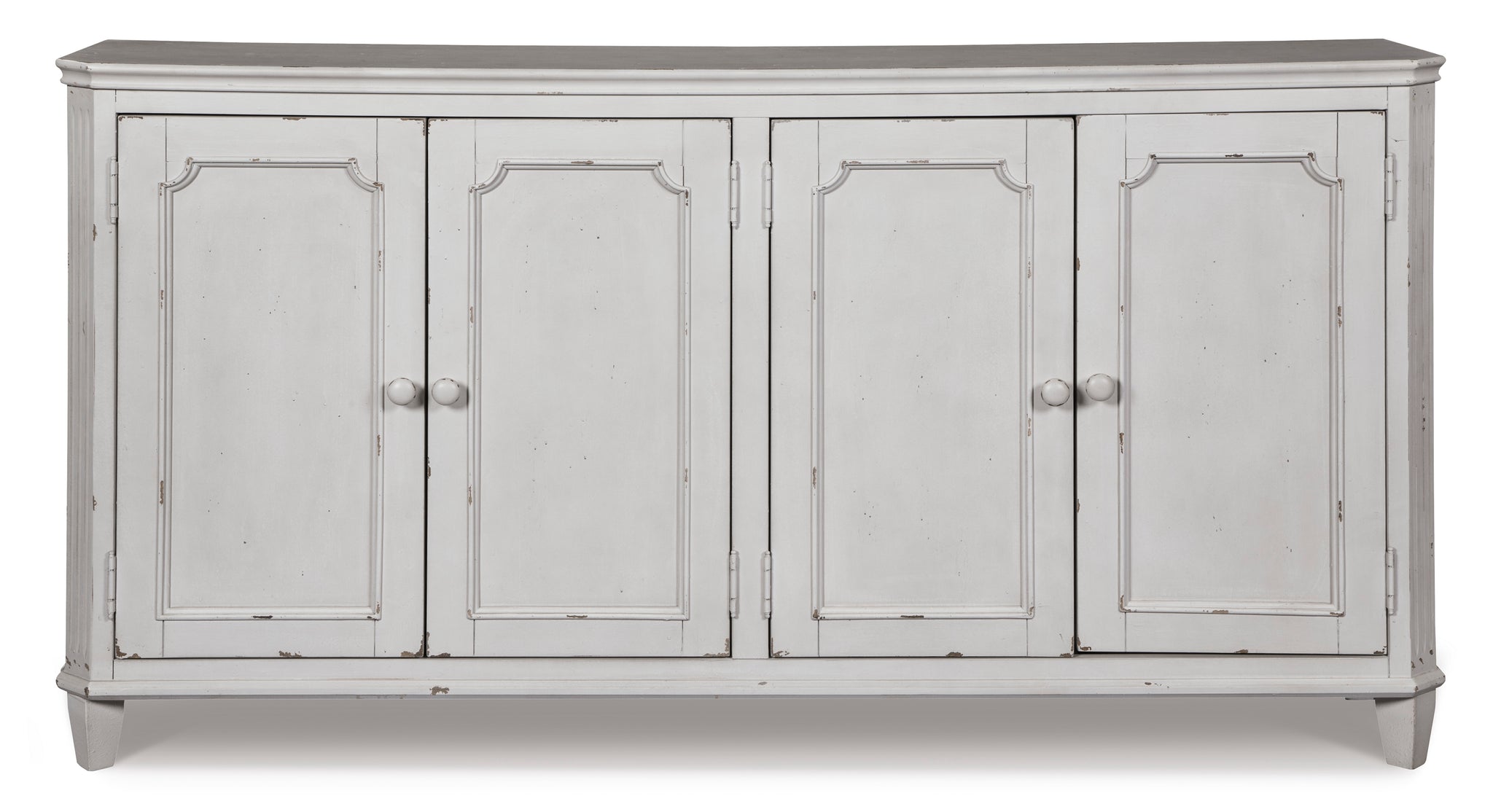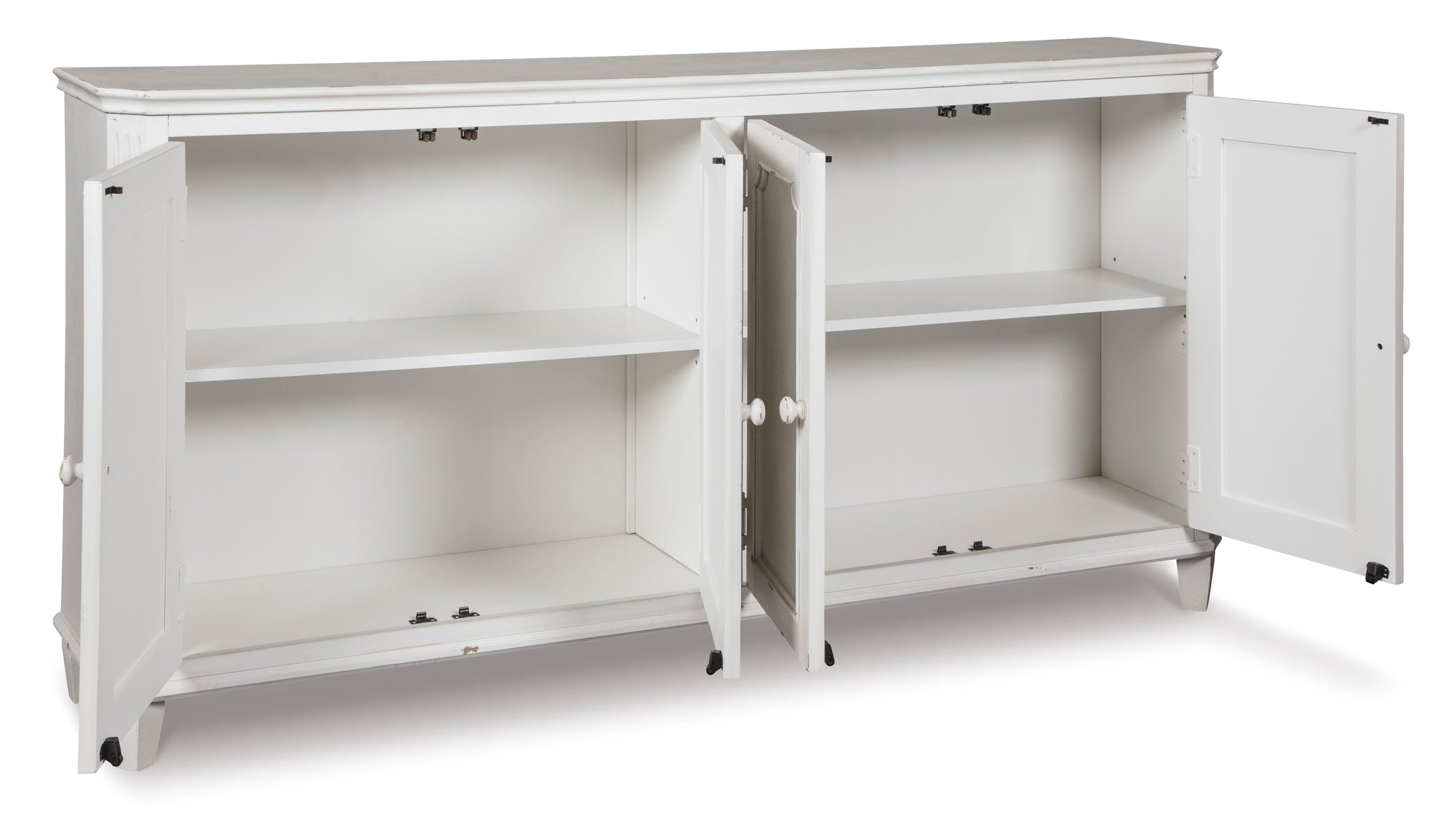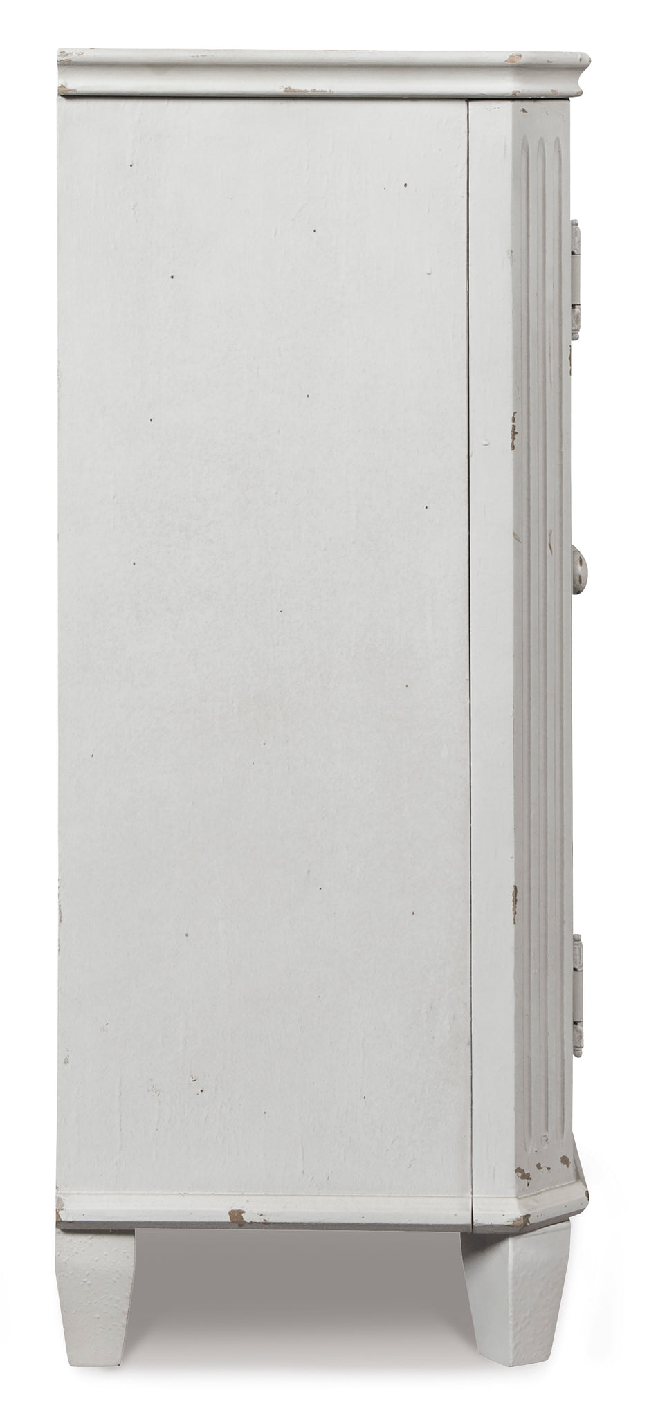 With its distressed vintage paint finish, fluted details and French provincial mouldings, this exquisite cabinet is sure to grace your space in such a très chic way. Adjustable shelved storage is abundantly practical, be it in a dining room, living room or entryway.