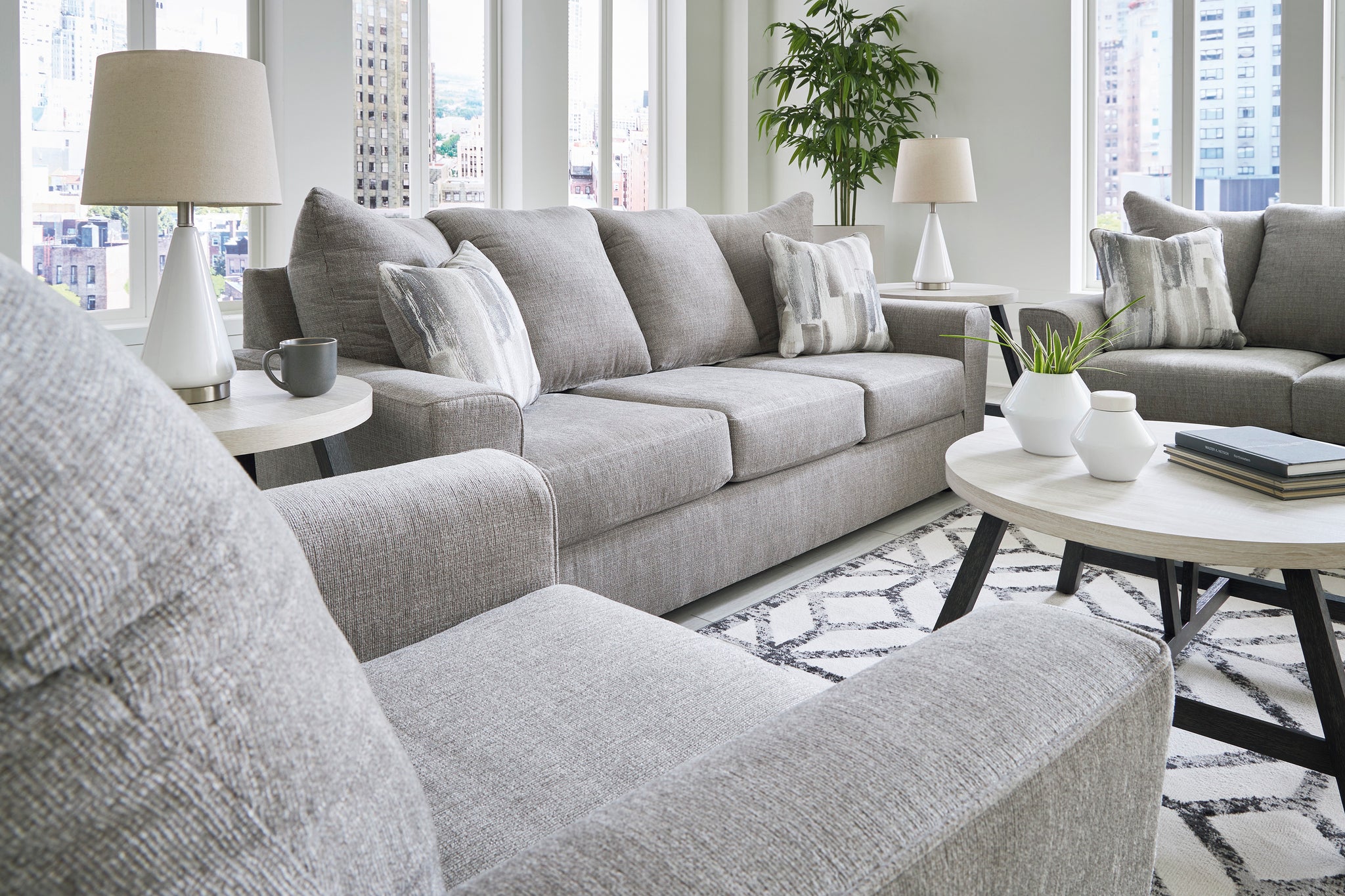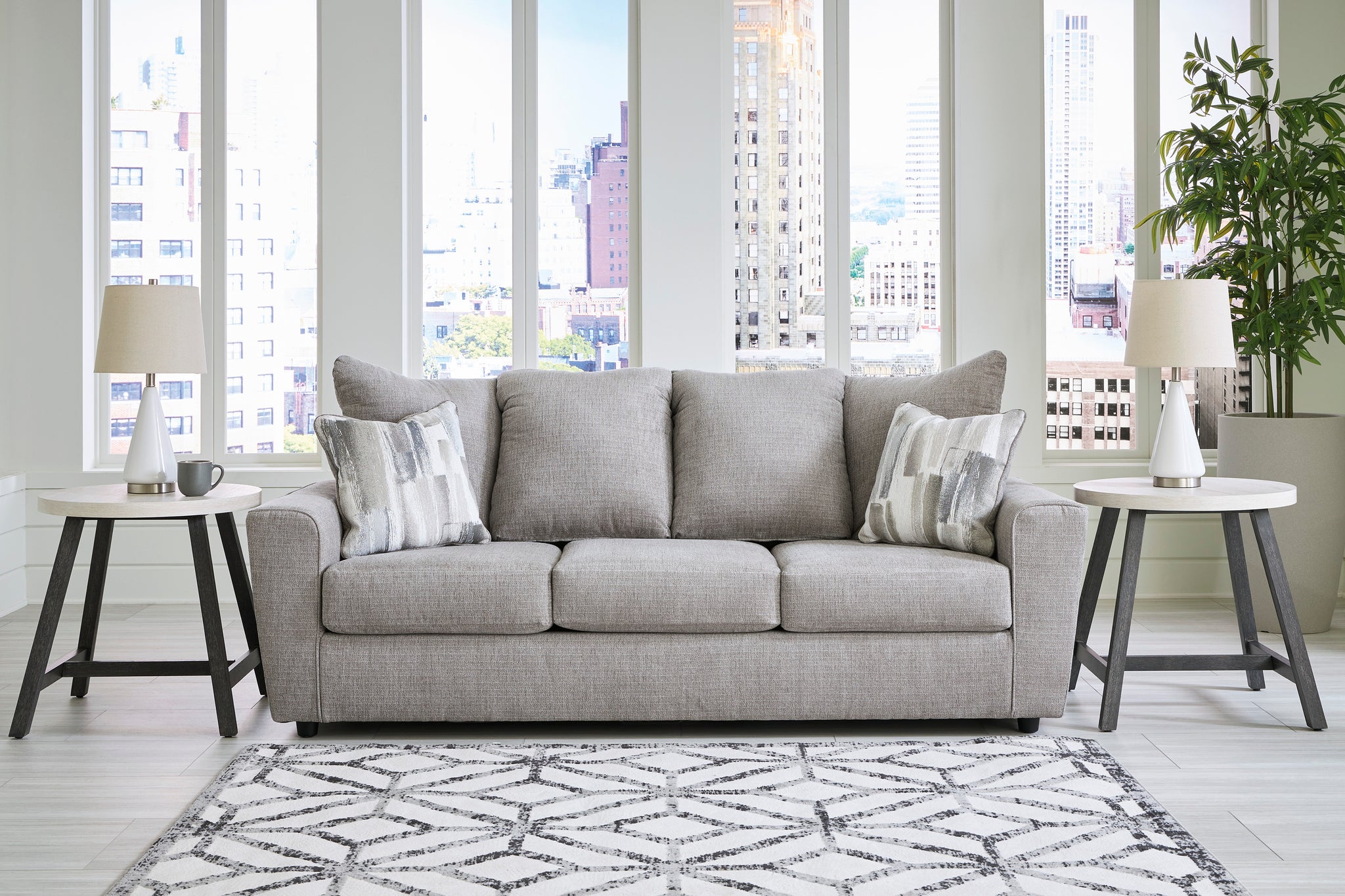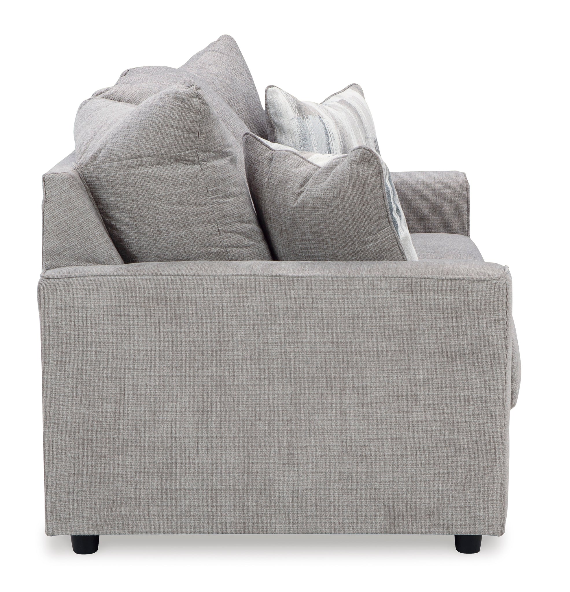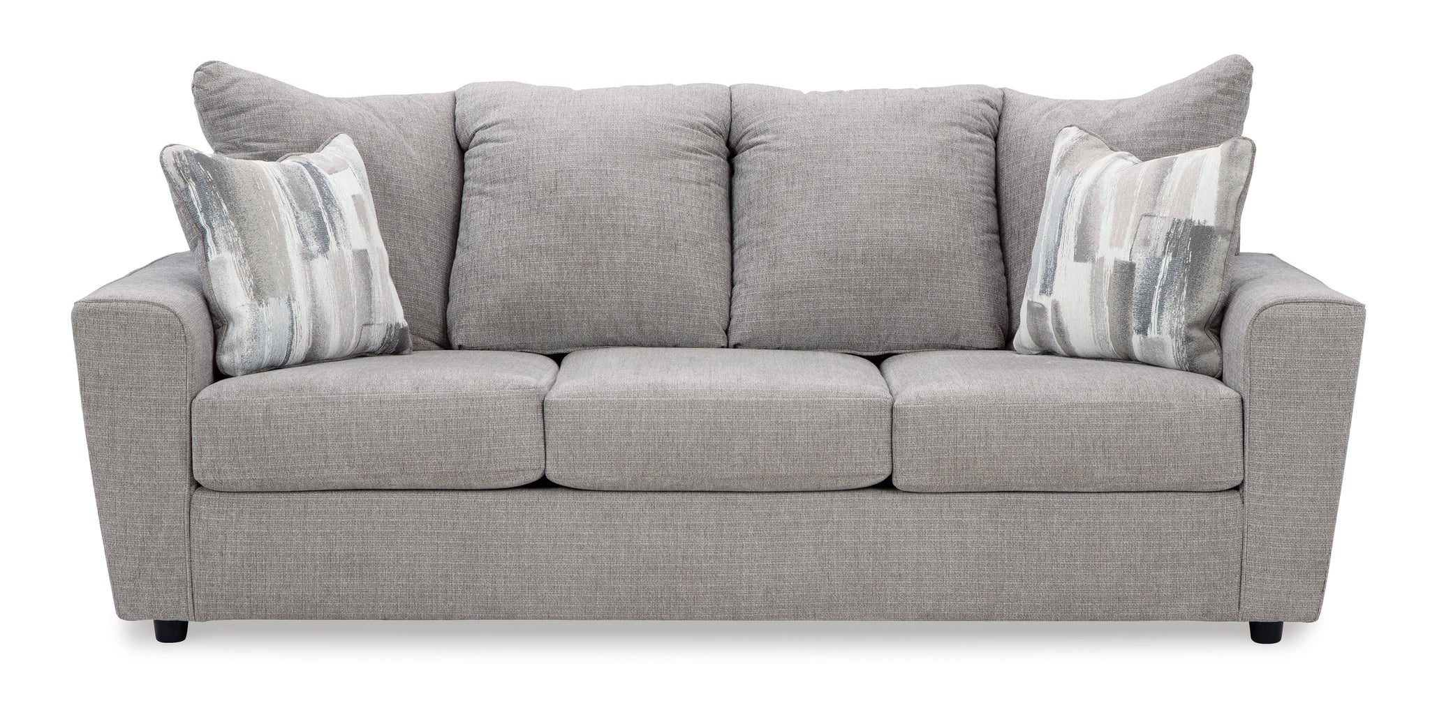 What’s new in neutrals? Shades of gray, of course. Embrace the sophisticated design trend with this gorgeous sofa that offers a clean-lined, contemporary style at a comfortably cool price. Sure to lift your spirits, the plush chenille fabric is fabulously neutral. Contemporary flared arms give it a distinctive flair. This sofa also arrives with two cool brushstroke accent pillows to elevate the taste and comfort level.