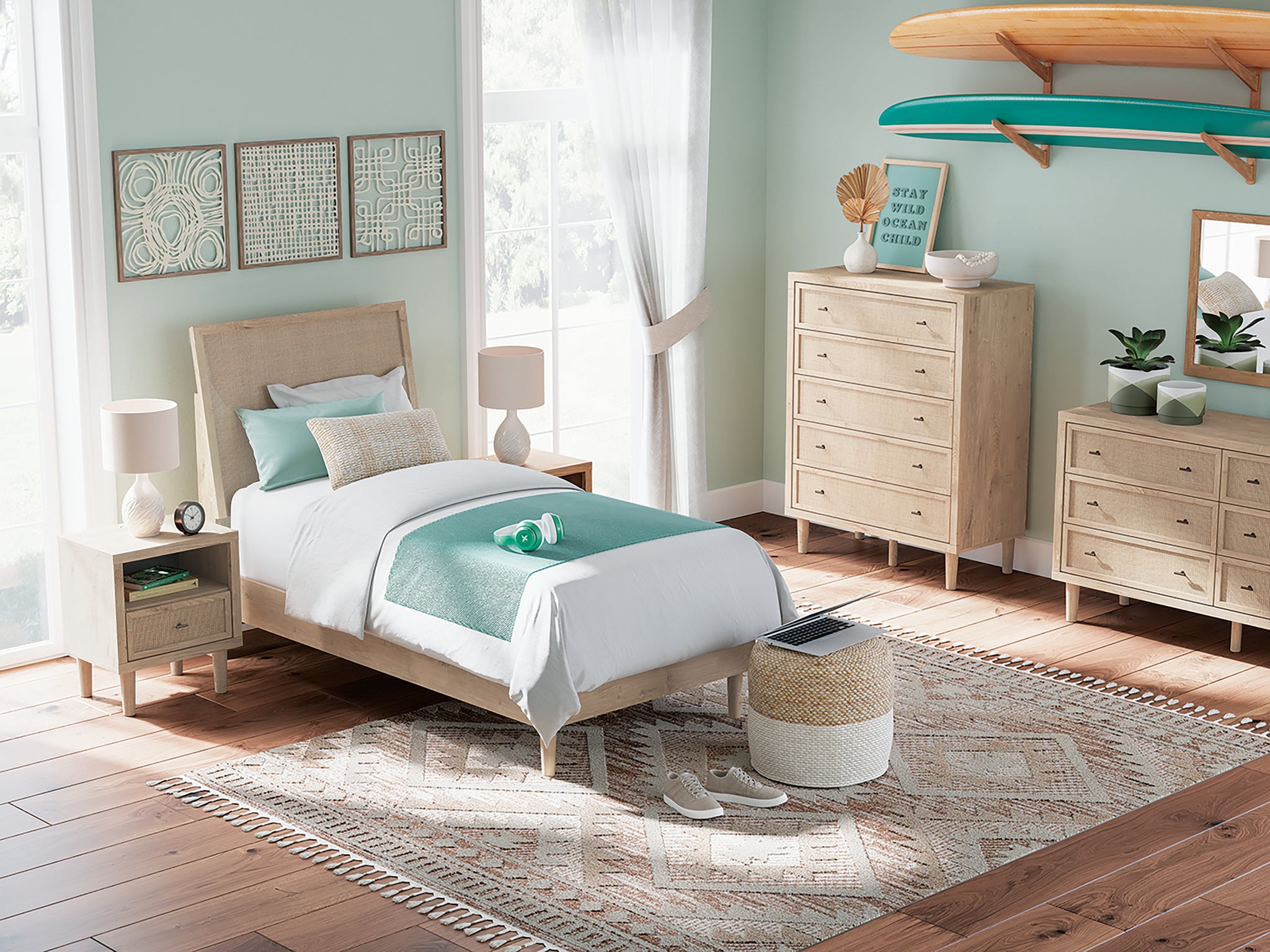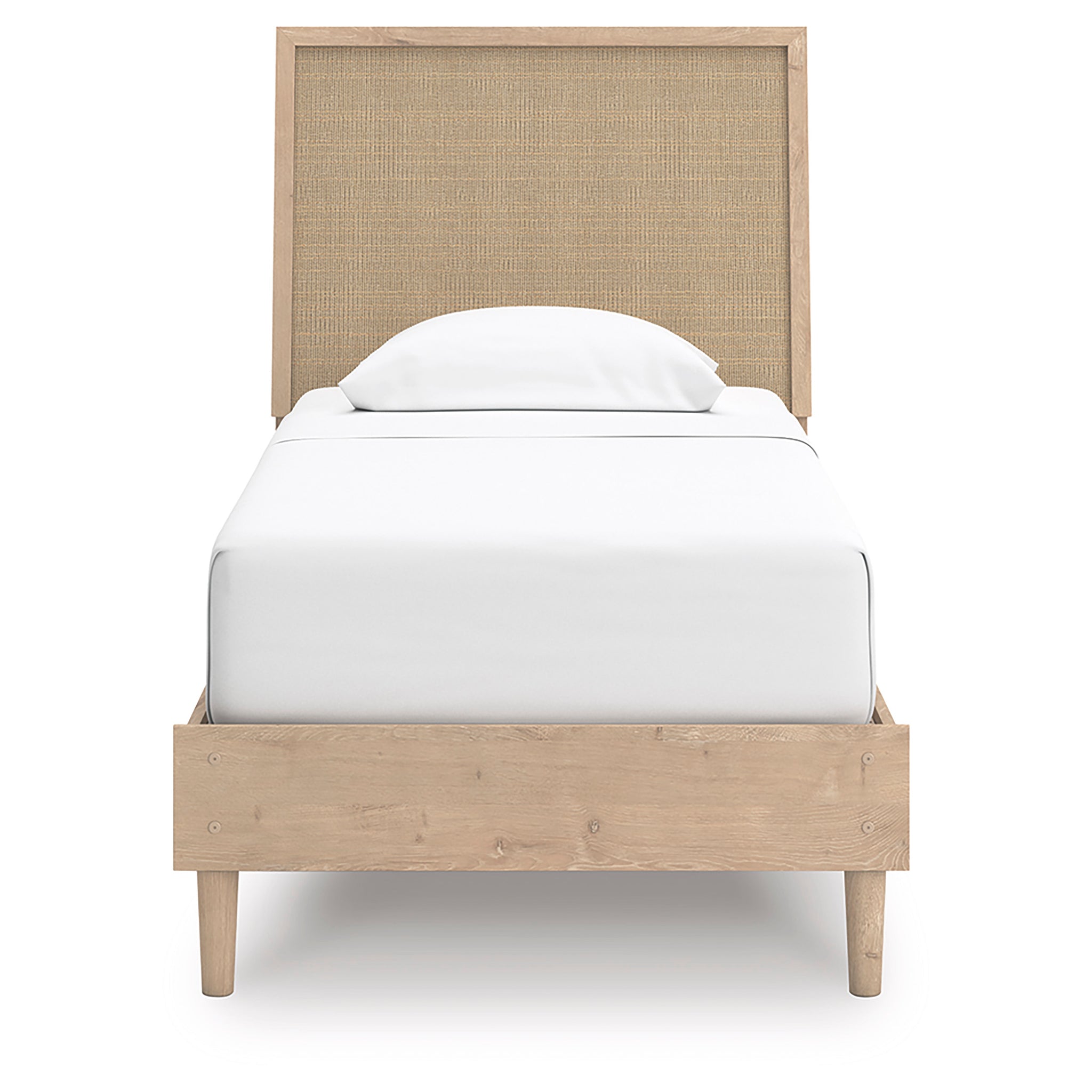 Clean-lined and contemporary—but far from stark—this twin panel bed is a fresh style awakening. Pairing a light finish with replicated oak grain and textured beige details that replicate the look of cane, its mixed materials bring a naturally versatile vibe to your bedroom. Talk about style with added dimension. The bed's simplicity plays perfectly with the modern aesthetic and is the stuff dreams are made of.